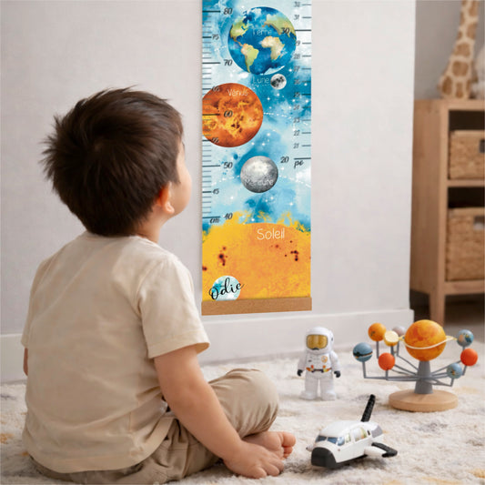 ➌ Personnalisable — inscris directement la taille de ton enfant avec un crayon permanent.