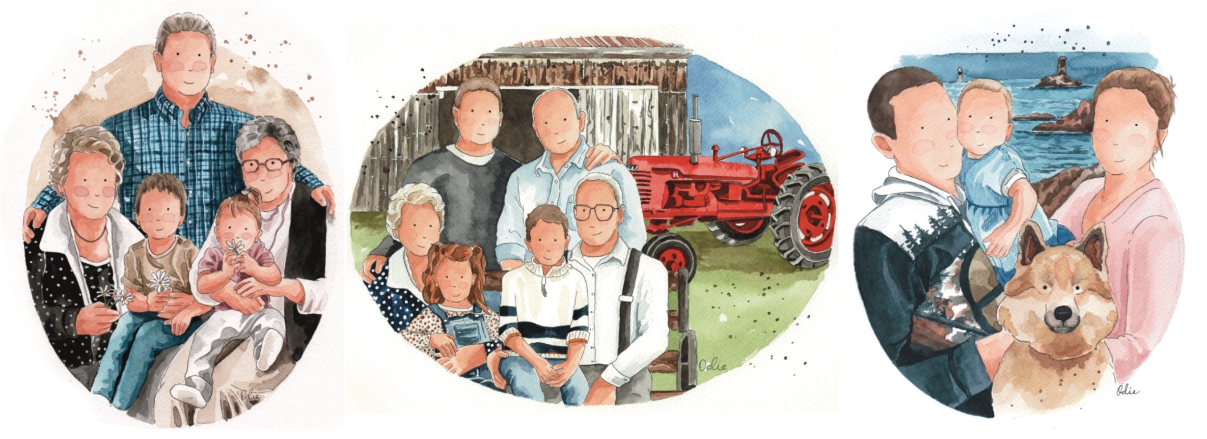 Je ne peux dire que du positif de mon expérience. À partir de plusieurs photos, récentes et anciennes, l’artiste a réussi à représenter les êtres chers, dans son style joyeux et intemporel. Le résultat à susciter beaucoup d’émotions mais aussi beaucoup de joie. Cette œuvre aura pour toujours une place dans notre maison et dans notre cœur pour commémorer les êtres chers qu’elle représente! - Camylle Audrey